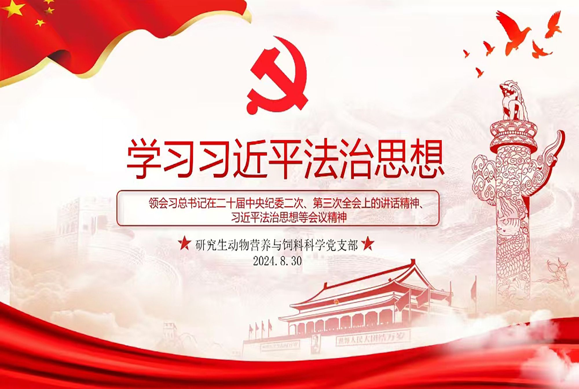 为使同学们增强法治意识,提高运用法治思维和法治方式解决问题的能力,8月30日,公司研究生动物营养与饲料科学党支部在腾讯会议开展“学习习近平法治思想”专题学习会,本次会议由公司研究生动物营养与饲料科学党支部宣传委员杜娟主讲主持,支部全体党员参加。