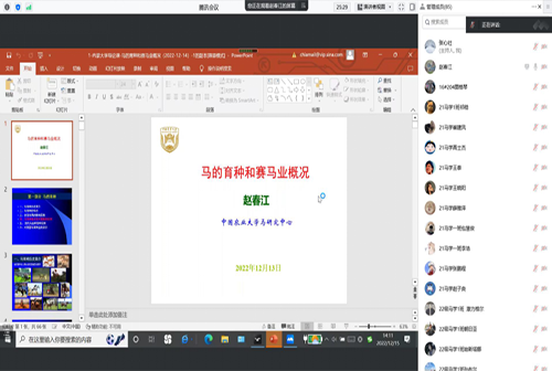 为加强马业科学专业班级(简称马学班)员工对专业的进一步了解,为后续的课程学习和实践奠定基础,2022年12月15日下午和16日上午公司通过腾讯会议线上开展专业导论课程,本次课程分别邀请中国农业大学动物科技公司、中国农业大学马研究中心主任赵春江副研究员和聊城大学农学与农业工程公司副经理、聊城毛驴高效繁育与生态饲养研究院副经理、山东省现代农业产业技术体系驴产业创新团队岗位专家刘桂芹教授主讲。本次导论课程分为两天进行,由马业课程的专业负责人芒来教授、核心课程老师以及21级、22级马学班全体员工和马属动物研究中心部分研究生参加。