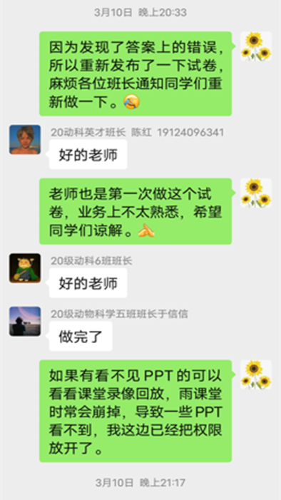 母亲的困惑,被女儿及时察觉,作为一名同样因为疫情被迫在家上网课的大二员工,对于母亲不精通网络授课的情况,她及时予以了帮助。帮忙调试设备,帮助母亲与雨课堂管理员进行沟通。此外,她还发现,雨课堂授课过程中教师是不能及时看到员工的上课状态的,这不利于教师了解员工知识的掌握程度。于是她和母亲尝试用雨课堂和腾讯会议结合的方式上课,没想到收到了良好的效果。雨课堂和腾讯会议相结合,员工在雨课堂实时观看PPT的同时,实现了老师和员工在腾讯会议实时互动。此外,她从员工的角度还给予了母亲很多可行性的建议。她说:“作为一名员工,我们希望老师在第一节课的时候,就可以告知同学们这门课程平时成绩和期末成绩的计算方法以及课程的考试范围,这样同学们就能有针对性的进行预习和复习。“同时希望老师能定期更新PPT,让同学们总保持一种耳目一新的感觉,这更有利于我们专注的学习”。