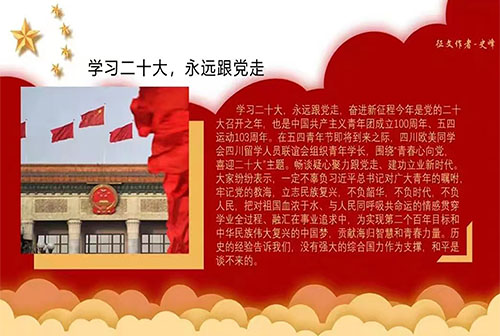 活动伊始,部分同学朗读有关“二十大”主题征文,展现出同学们对党和国家的热爱以及“一心向党,忠心为党”的坚定信念。随后,全班同学分组献唱爱党歌曲,激起同学们对党的无限热情。活动中,刘艺播放爱国主题视频,向同学们展示自建国以来我国的沧桑巨变与重大成就。活动最后,刘艺对本次活动进行总结,希望同学们坚定跟党走,努力学习党的文化知识,争取为党的事业做出积极贡献。