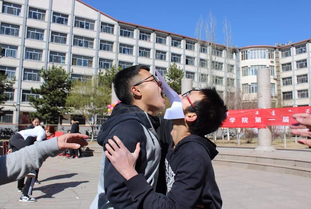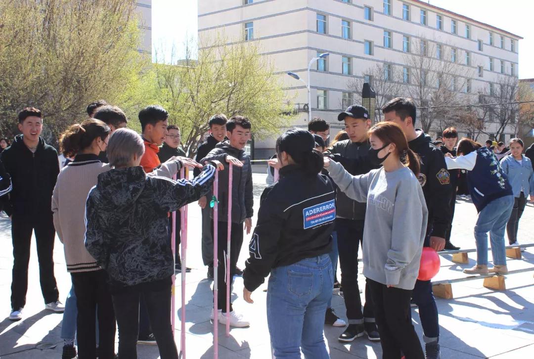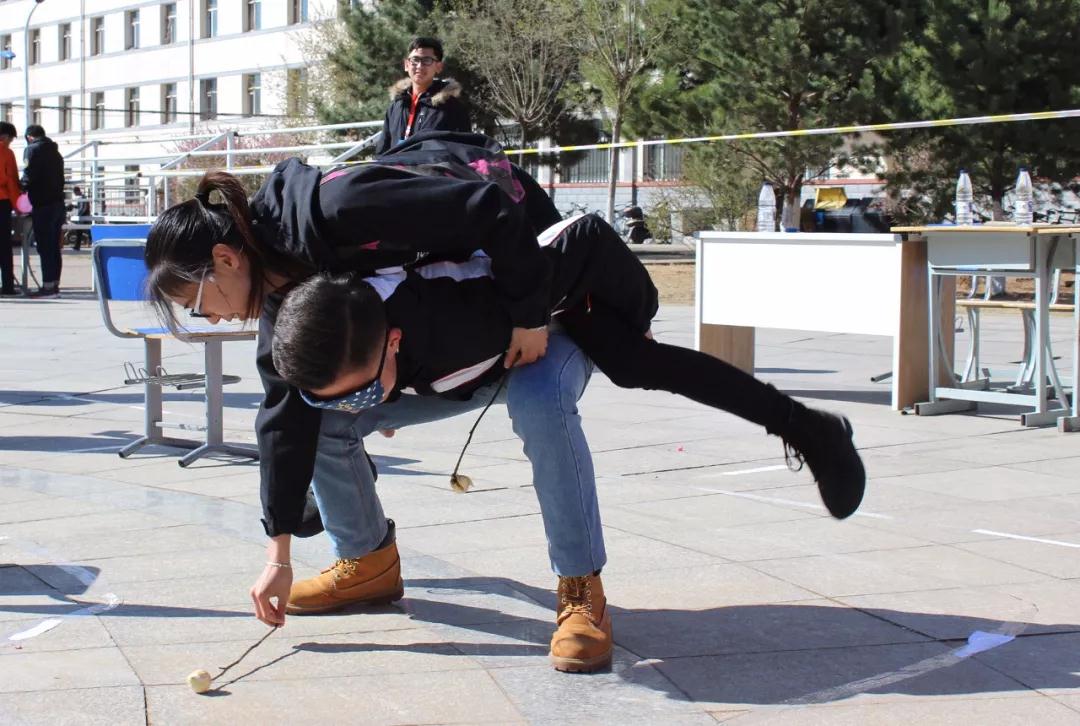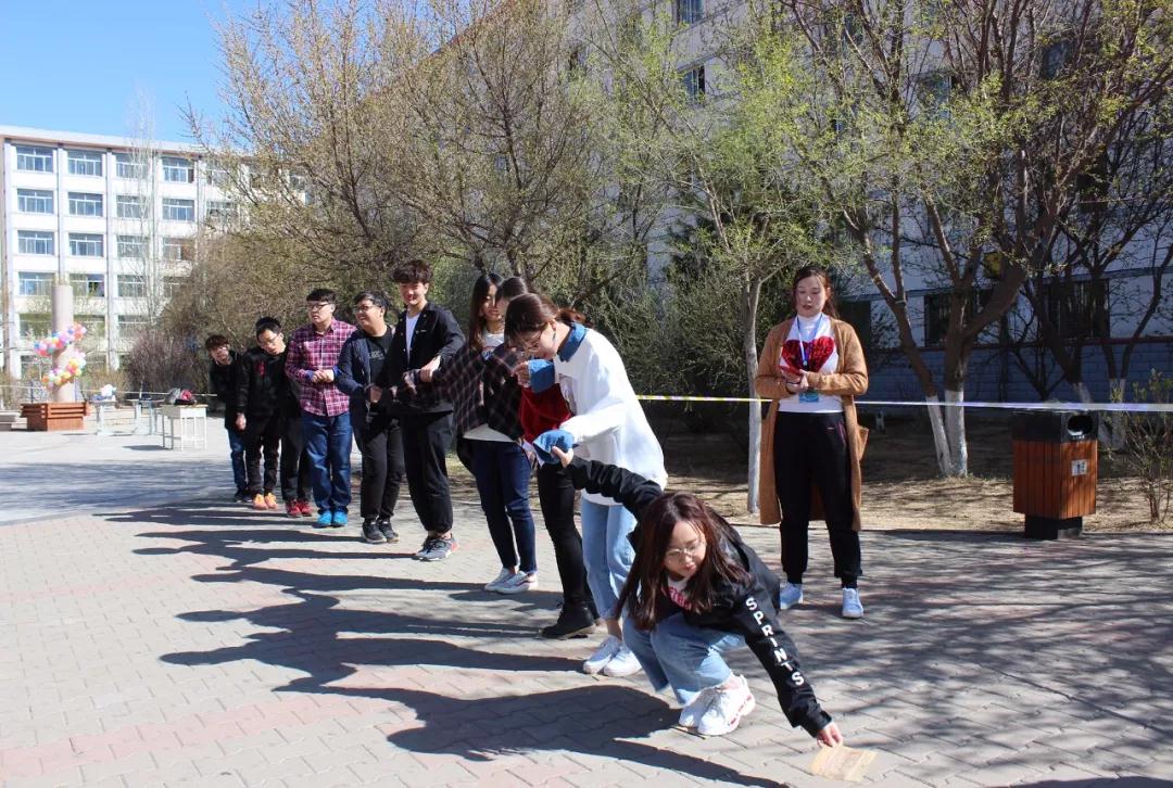 主持人秦箐、盖宇欣、伊日贵介绍了比赛规则和评分标准后,周琦致开幕词并宣布比赛开始。同学们按早上的抽签顺序站好并开始了今天的比赛。此次比赛分为团体赛和技巧赛共九项,其中团体赛有链接加速、十人十一片、吸纸片传情、森林永不倒;而技巧赛则有吃饼干、身体运气球、瞎子背瘸子、吸管运输、扶手过杆。其中,“森林永不倒”需要团队两人为一组共同合作,双手之间夹一张互推,同时踩上横杆,移向横杆终点。不仅需要把握对方的力量,同时也考验了队友之间的配合。同学们以班级为单位团结协助、互帮互助、尽最大的努力为团队争取荣誉。最终16级蒙二班、17级蒙四班、17级蒙三班以团队之间的超高默契分别取得了比赛的第一、二、三等奖。
