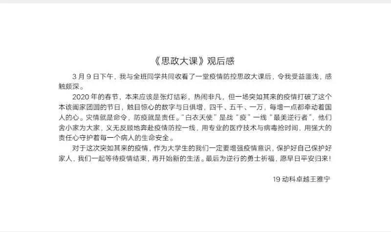 此次思政课进一步弘扬和传播了爱国主义精神,让同学们深刻认识了中国在抗击疫情时,中国特色社会主义制度的显著优势,同时也坚定了中国人民打赢这场防控疫情战争的信心和决心。