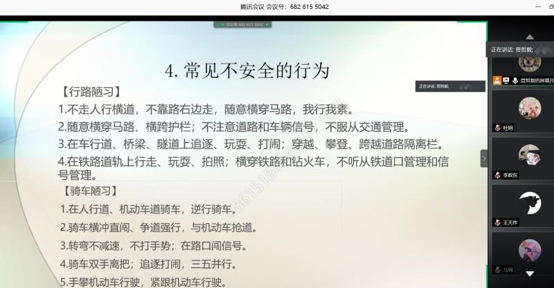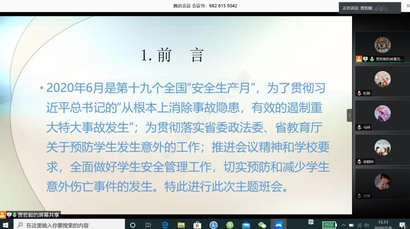 7月7日晚7点,17动科7(蒙)班在腾讯会议上召开了“消除事故隐患,筑牢安全防线”的线上主题班会,首先由班长分享了提前准备好的安全教育主题视频后进行讨论,然后由班主任重点强调暑期安全防护知识,内容包括新冠疫情防护,溺水防护、交通安全,网络诈骗防护等方面,尤其提醒目前在外实践的同学注意人身安全。最后布置了暑期的学习计划和考研备考计划。