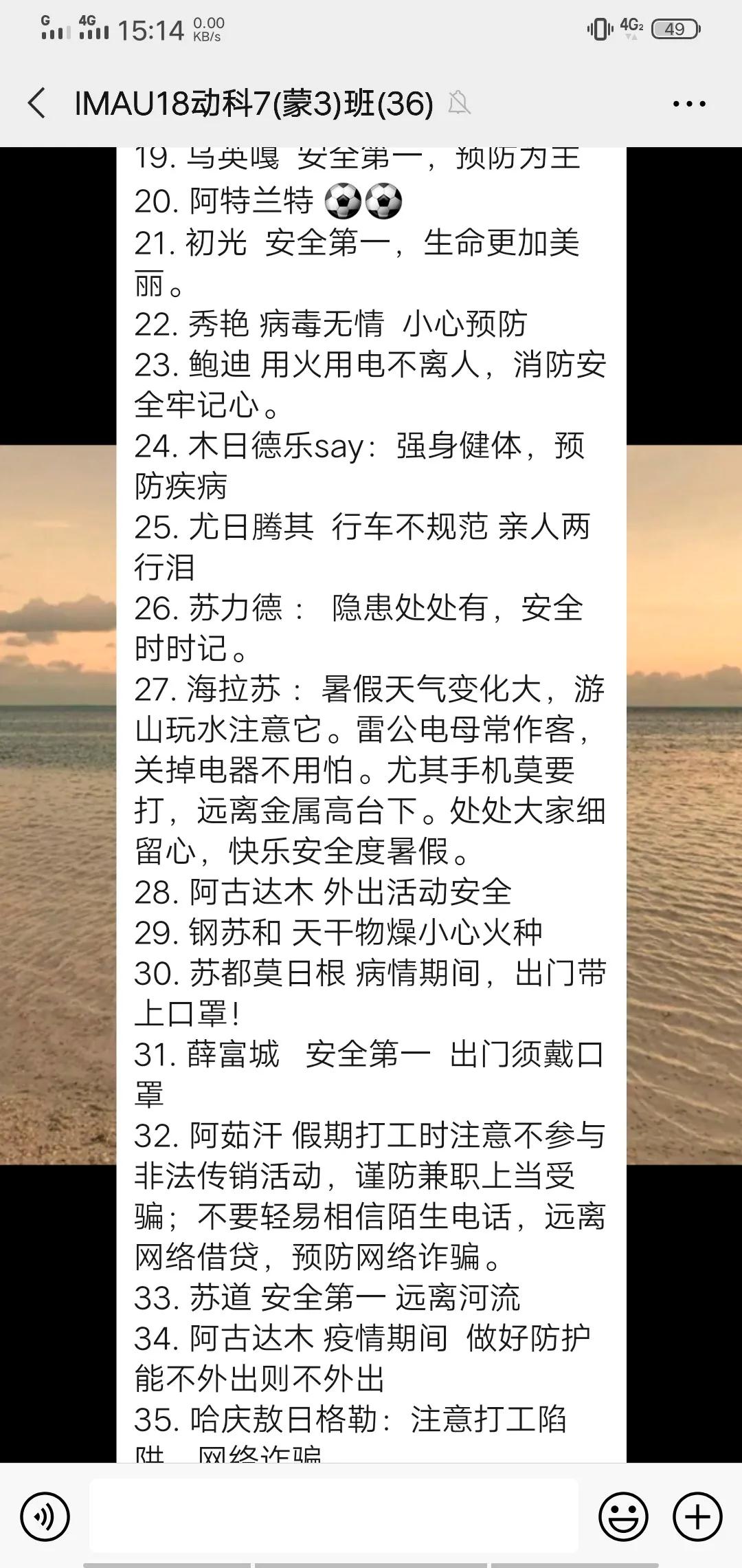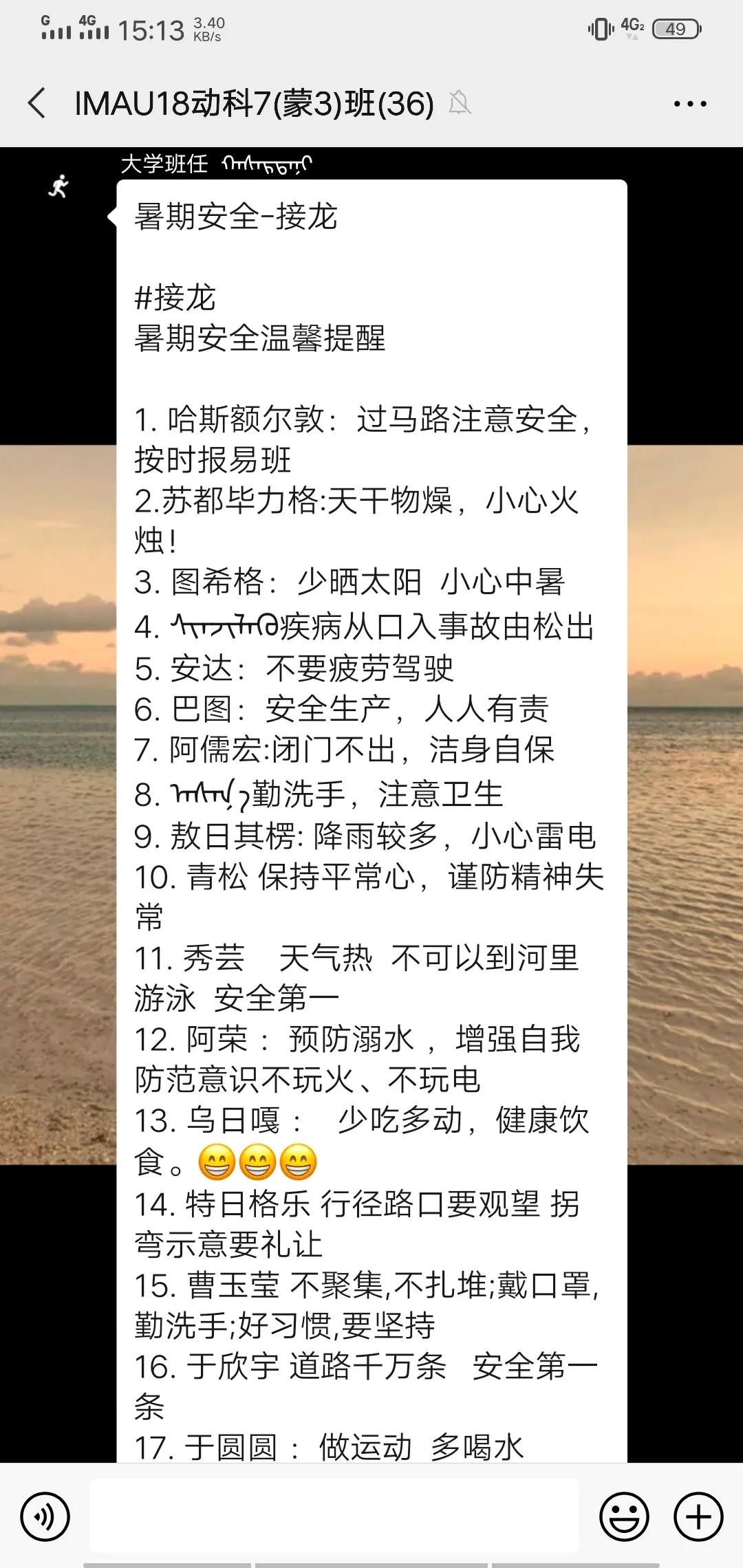 7月9日,公司18动科七(蒙)班在微信上开展“消除事故隐患,筑牢安全防线”主题班会。18动科七(蒙)班班主任哈斯额尔敦老师和全班同学参加。