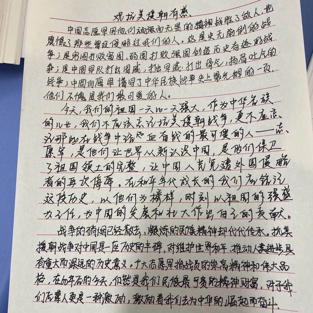 中国志愿军跨过鸭绿江开赴战场,这一战打破了美军不败的记录!抗美援朝的胜利,体现了我们国家的意志和信念,这也让我们国家树立威信。我中华儿女雄赳赳,气昂昂,使美帝国侵略者低下头颅,使国家得到数十年发展的时间。回首这历史,中国人民保卫国土的信念从未动摇,这正义性则不可抹杀。作为团员的我们,不仅要珍惜老一辈的战果,更要积极投身于新时代新社会的建设中去。正义终将胜利,英雄永垂不朽!让我们对这战争中有过贡献的英雄们致以崇高的敬意。