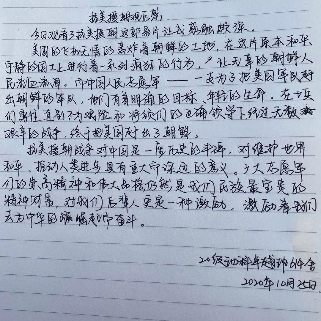 本次云团课,我更加了解了和平来之不易这句话,了解了抗美援朝战士的不易,明白了我们更加应该珍惜今天都中国。