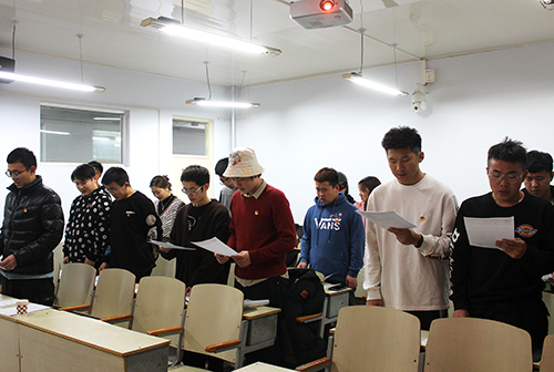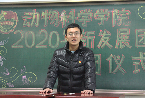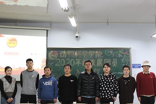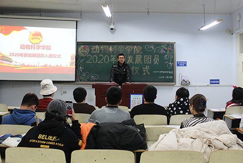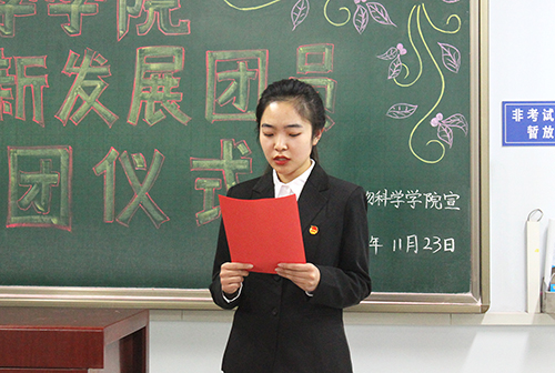 会议伊始,全体起立,奏唱国歌。随后,主持人李浥祯宣布新团员名单,张永昌老师为新入团成员代表佩戴团徽。主持人强调,团徽象征着共青团在马克思列宁主义、毛泽东思想的光辉照耀下,团结各族青年,朝着所指引的方向奋勇前进。接着,主持人领誓,新团员宣读入团宣誓。会议中,张永昌老师以自己上大学时入团的经历介绍自己对团员意识的认识,他表明,新团员应该向团组织表明自己的决心,牢记团的誓言,肩负起做一名共青团员的光荣感和责任感,增强为共产主义奋斗的信念。最后,全体团员肃立,奏唱团歌。