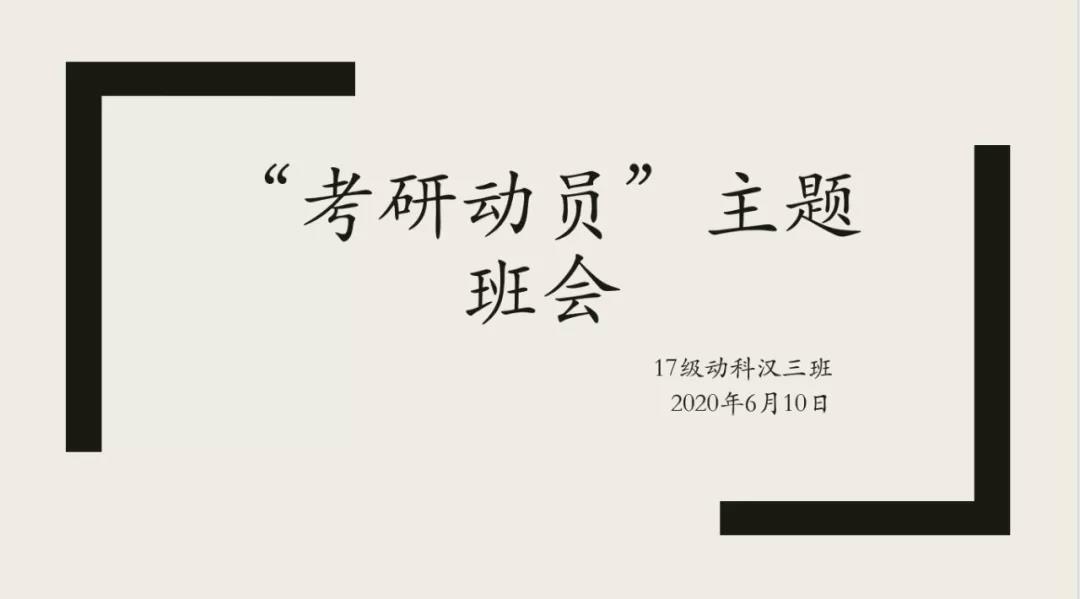 6月10日,公司17级动科汉三班开展线上“考研动员”主题班会。本次会议邀请到公司16级张崇妍、秦箐、许利群、赵宇辉和杨洋同学传授经验,班主任刘志红和全班同学参加,团支部书记兰海姣主持会议。
