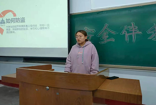 活动伊始,赵芷怡同学介绍此次活动举办的目的和意义,她列举了近期公司出现的盗窃、诈骗行为和生活中的安全隐患,并从如何防盗、防诈骗、人身安全、防火须知、交通安全五个方面进行讲述。随后,同学们分享自己的经验,并进行了相关的讨论。活动最后,班长杨笑愚做活动总结,他表示树立安全防范意识、确保自身安全是一生都要牢记的话,要珍惜自己的生命,才能珍惜他人生命。