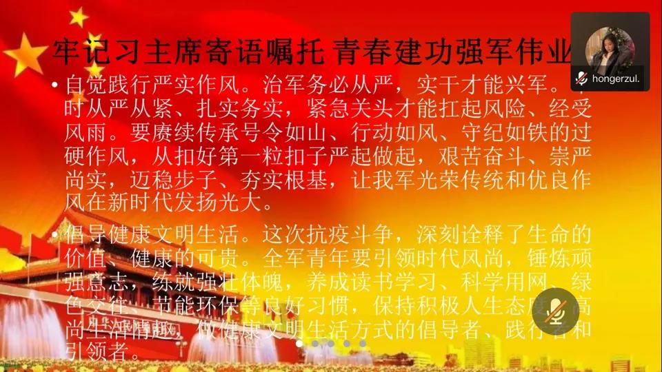 活动伊始,在团支书红格尔卓拉的主持下,同学们畅谈了彼此的居家生活以及线上学习的体会。活动中,团支书红格尔卓拉组织同学们共同学习了习近平总书记对新时代青年的寄语,大家纷纷表示要继承和发扬五四精神,在实现中华民族伟大复兴中国梦的新长征路上奋勇搏击。最后,团支书红格尔卓拉询问并了解到同学们各科的学习情况,她表示同学们要继续保持现在的学习状态。