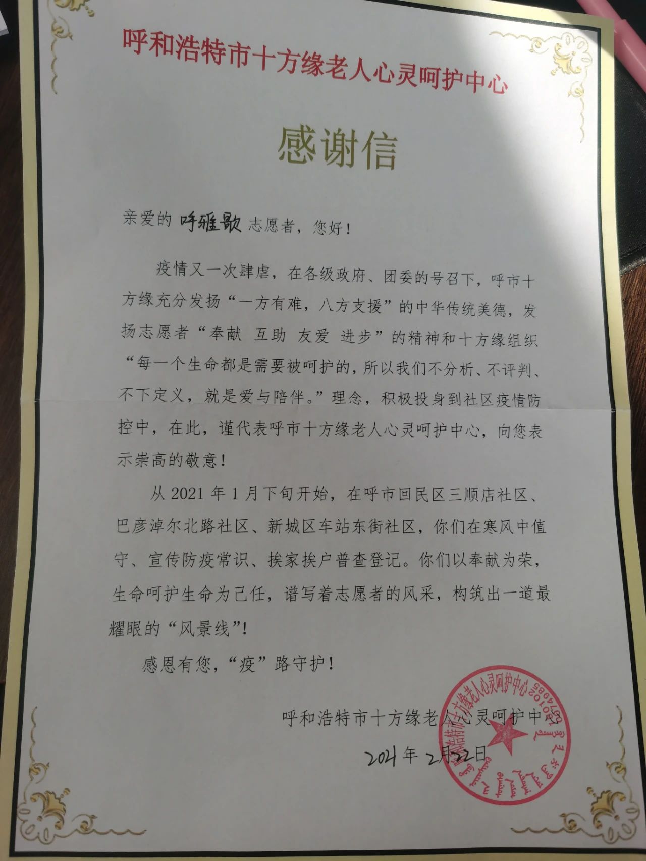 我叫呼雅歌,来自必一运动官网,很荣幸能够作为志愿者代表在这里发言。在本次志愿活动当中,我参与了三顺店社区和车道东街社区的志愿服务活动,进行了站岗督察、宣传垃圾分类、入户排查登记等志愿活动。