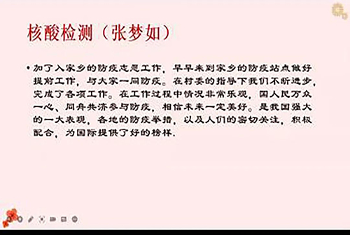 会议伊始,苏哲说明本次次团日活动开展的目的是为了让同学们交流实践的经历,分享自己在假期实践过程中的经验与收获。随后,以宿舍为单位,派出代表向班级同学分享展示自身的实践活动内容。贾骏腾向同学们介绍了青年老员工参加社会实践的意义所在,及参加社会实践对老员工带来的好处。朱旭在假期期间帮助老师进行了调研,详细地介绍了他的调研内容。刘洁在假期观看了《长津湖战役》,并分享了她所感悟到的长津湖精神。会议最后,苏哲对本次活动进行总结,表明在参加社会实践时,一定要摆正自己的态度,认真完成自己所需要完成任务,为社会奉献一份力量,同时告诫同学们疫情仍未结束,切勿掉以轻心,做好个人防护。
