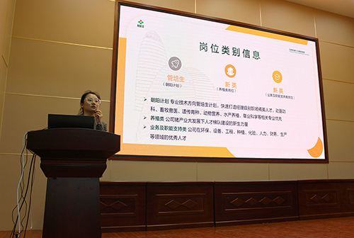4月20日,新希望六和股份有限公司在公司8号教研楼三楼报告厅开展2021校园招聘宣讲会,本次招聘宣讲会由公司20级水产二班呼雅歌同学主持,新希望纵队蒙东战区总经理何树旺、人力资源经理苏一凡、兽医公司党委副书记高常福及公司党委书记包国荣出席,公司部分员工参加。