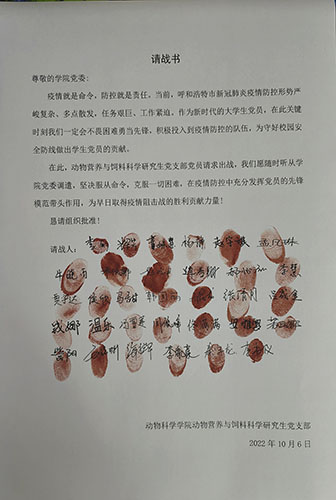 自封校以来,公司动物营养与饲料科学研究生党支部成员迅速转变角色,坚决地写下了请战书,义不容辞地成为坚守公司抗疫一线的志愿者,“全天候”为员工服务。