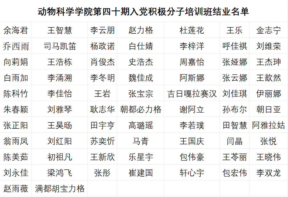 公司第四十期入党积极分子党课培训已顺利结束。本次培训班从10月16日开班,至11月12日结业考试,经过21学时集中授课,10学时网上系统自学,3学时视频学习及观后交流,3学时义务劳动,8学时党课自主学习汇报,共计45学时。本期学员共有85人,其中有79人参加考试,最后73人通过考试。结业成绩单如下: