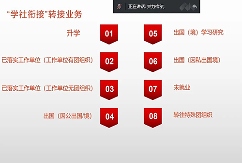 会议伊始,其力格尔表明本次会议旨在加强和改进新时代团员教育管理工作,希望同学们重视团组织工作转接工作。期间,付瑜针对公司智慧团建的日常操作进行指导,并围绕使用环境、转接申请发起方式以及“学社衔接”转接业务展开细致讲解。随后,其力格尔提到同学们应当提前联系社区来转接,以避免工作失误。会议最后,其力格尔针对同学们提出的相关问题一一进行解答,强调团籍关系和转出档案的重要性,并切实做好宣传工作。