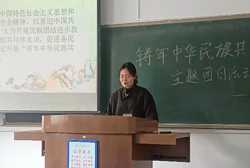 活动伊始,团支书表示本次活动旨在贯彻落实习近平新时代中国特色社会主义思想和党的十九届五中全会精神,以喜迎中国共产党成立一百周年为契机,大力开展民族团结进步教育,引导大家铸牢中华民族共同体意识。随后,团支书讲解了“四个共同”,深刻揭示中华民族共同体意识的内生动力。期间,班级同学纷纷表示,要发扬时代精神,做时代有为青年。活动最后,团支书带领同学们重温入团誓词,进一步强化了团组织的组织性、纪律性。