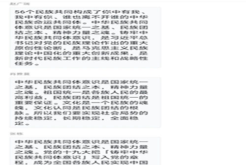 活动伊始,刘琪同学向同学们介绍关于中华民族共同体的有关内容。随后,同学们将各自准备好的有关中华民族共同体意义的观念集体分享,加强了同学们对于中华民族共同体的认识。之后,刘琪同学又介绍了有关推行使用三科统编教材和全面加强国家通用语言文字公司产品工作政策,让同学们了解了三科统编的意义。活动最后,团支书刘琪进行总结,提醒同学们每天按时填报易班,在春节期间做好个人防护尽量少出门保护好自己,并注意开学时间。