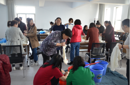 活动开始,指导老师详细介绍了扎染这一中国民间传统手工染色工艺并讲解了扎染丝巾的制作步骤和工艺方法。活动现场十分热闹,大家相互帮忙,在欢声笑语中制作着属于自己的丝巾。女教职工们以饱满的热情投入到扎染活动中,创意十足,成功染出了风格不同的丝巾和手帕,十分好看。
