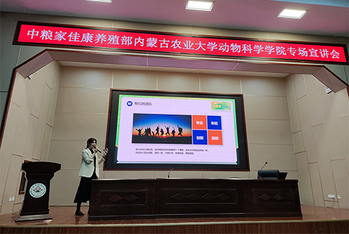 会议伊始,王铭铭对中粮集团、中粮家佳康有限公司及养殖部情况进行介绍,简要说明公司业务包括饲料生产、生猪养殖、肉制品销售等。随后,陈康逸以展示图片的方式介绍工作、生活环境,帮助同学们对公司有进一步的了解。期间,王铭铭表明公司会为员工提供发展培训、发展空间、免费食宿,公司重视员工差异,秉持内部晋升原则,实行人才培养阶梯计划,以保障员工的强化培养。而后,王铭铭对岗位需求进行详细讲解,并提供应聘方式,帮助同学们更好地得到就业机会。会议最后,同学们进行提问,王海森为其解答。