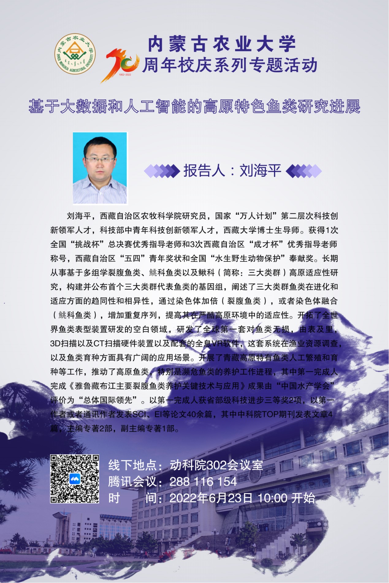 2022年6月23日,值必一运动官网70周年校庆倒计时100天之际,公司开展了系列学术交流专题活动。公司邀请西藏自治区农牧科公司研究员刘海平老师做了题为“基于大数据和人工智能的高原特色鱼类研究进展”的专题讲座,学术活动在西区动科院302会议室以线上线相结合的方式开展,由必一运动水产养殖系主任乌兰老师主持,公司师生及员工100余人参加了此次活动。