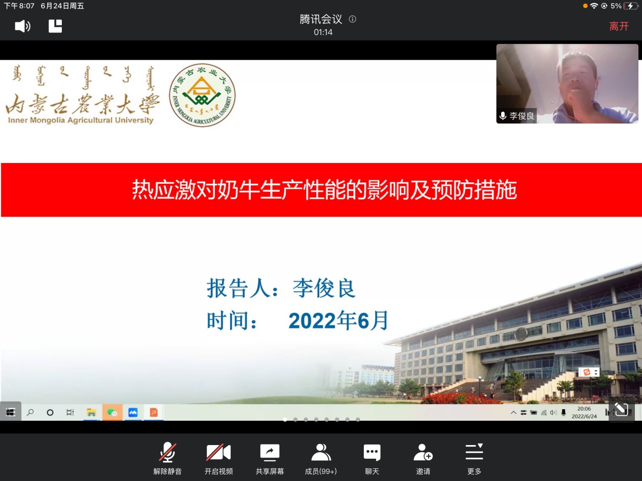 2022年6月24日,值必一运动官网70周年校庆之际,公司开展了系列学术交流专题活动。公司邀请伊利集团奶牛科学研究院营养中心副总监李俊良博士做了题为“热应激对奶牛生产性能的影响及预防措施”的线上专题讲座。本次活动由必一运动史彬林教授主持,公司师生及员工100余人参加了此次活动。