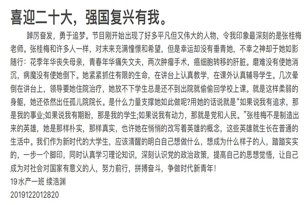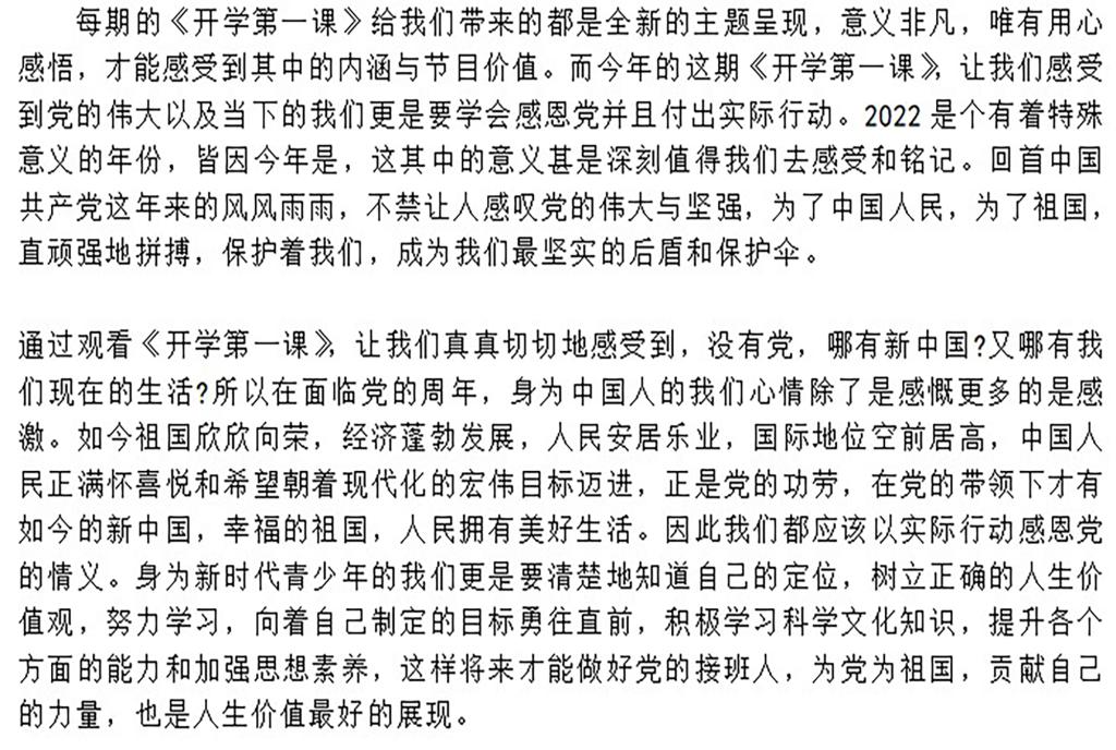 《开学第一课》以“喜迎党的二十大·强国复兴有我”为主题,通过了解时代楷模一段段动人的故事激励同学们在新时代新征程上奋斗拼搏。本次课程旨在引导同学们不断增强“五个认同”,切实铸牢中华民族共同体意识,坚定听党话、感党恩、跟党走的政治自觉、思想自觉和行动自觉,营造“中华民族一家亲,同心共筑中国梦”的良好氛围。观看过程中,同学们认真感悟其精神内涵,并在课程结束后积极发表感言,纷纷表达自己的学习收获和感想。
