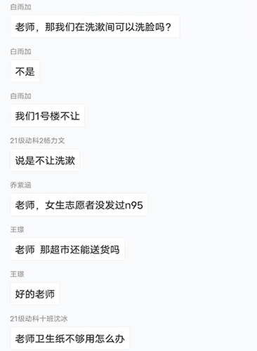 会议伊始,其力格尔表明教职工团体及员工组织近日所进行的疫情防控工作,对严防疫情蔓延和保障校内员工的正常管理起到了积极作用,并鼓励大家要保持工作劲头,继续为抗疫工作奋斗,献出自己的一份力。同时,其力格尔提到员工干部要努力克服工作中偶尔会有的情绪化问题,并起带头作用,充分发挥志愿者积极奉献、敢于牺牲的优秀精神品质。期间,青林向同学们简述目前的防疫形势,提醒同学们要多听官方消息,减少因信息产生的焦虑,并告知员工干部工作中有关安全检测的具体流程,加强了同学们对工作安全方面的信心。同时,青林向同学们说明饮食方面的供应计划以及获取药品的途径、时间段和具体方法,并详细指导同学们在宿舍内、走廊及卫生间等不同场合中的正确防疫方式,进一步保障同学们在特殊时期的生活。紧接着,青林表明员工干部们要发扬志愿者坚强勇敢的精神品质,共同守卫校园,对员工组织近期的工作提出表扬,并提到自己会接收同学们的各类反馈并及时给予帮助。其后,其力格尔再次强调现阶段防疫工作的重要性,希望同学们众志成城、共同努力,顺利完成抗疫工作,并提倡同学们在特殊时期更要节约粮食,为疫情防控助力。会议最后,其力格尔和青林就员工干部志愿者们提出的问题进行解答,并再次鼓励同学们要克服困难,共同保障防疫工作的顺利进行。