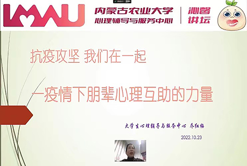 10月23日,公司在线上开展“抗疫攻坚我们在一起疫情下朋辈互助的力量”主题培训会,本次会议由公司全体心育委员参加,公司心理辅导与服务中心乔红梅主讲。