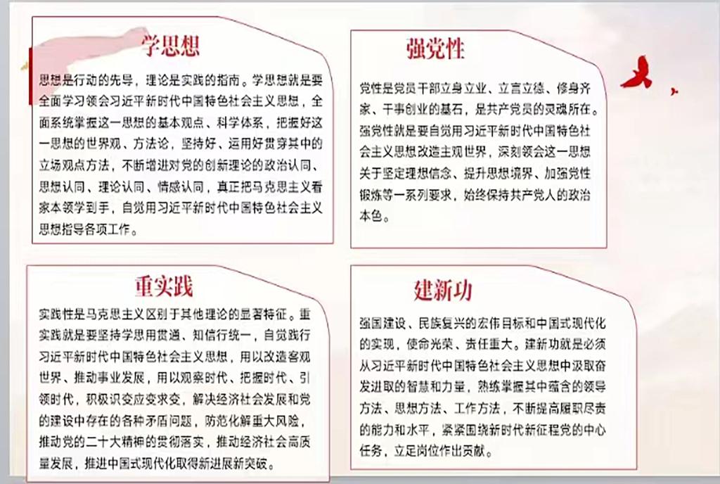 会议伊始,张银花表明本次宣讲课的主题是扎实开展主题教育,为奋进新征程凝心聚力。会议中,张银花以“党的二十大精神”为引题,向教职工讲解了开展主题教育的必要性与重要性。期间,张银花提到公司党委要落实立德树人的根本任务,团结带领全院师生以内涵发展、高质量发展为主线,积极锤炼党性修养,脚踏实地,埋头苦干。她讲到学习贯彻党的二十大精神的重要性,并示意主题教育是一次思想政治的大洗礼。会议最后,张银花表示全体教职工要坚持学思用贯通、知信行统一,努力在以学铸魂、以学增智、以学正风、以学促千方面取得实实在在的成效,发扬斗争精神,强化担当作为。