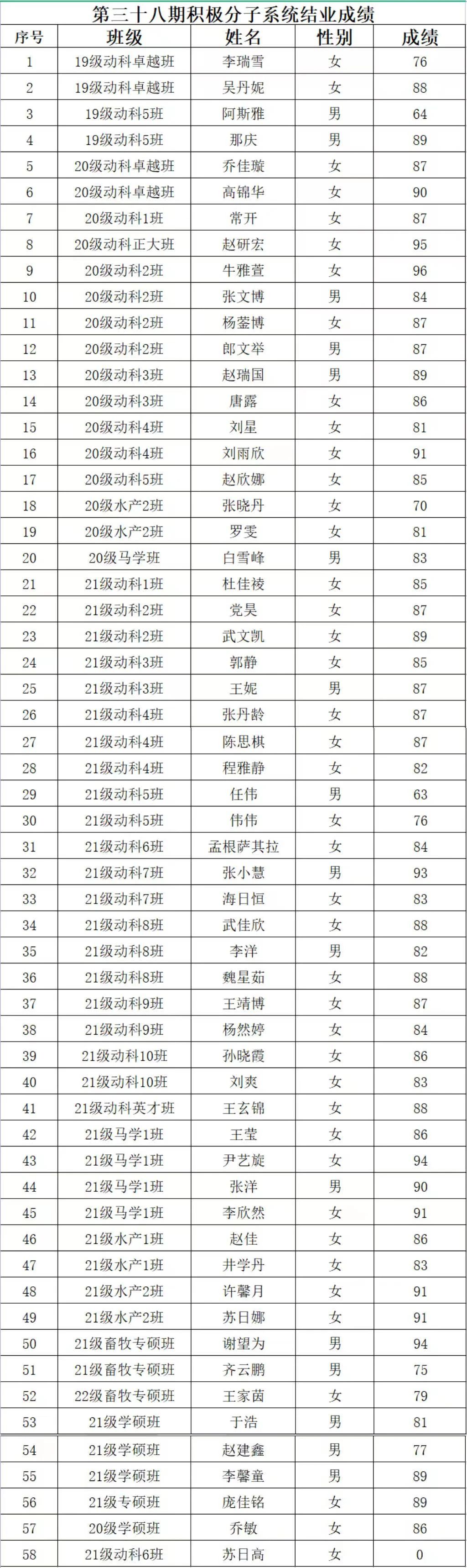 公司第三十八期积极分子党课培训已顺利结束。本次培训班从10月21日开班,至11月28日结业考试,经过10学时的集中授课、5学时的社会实践、30学时的分组自学,共计45学时。本期学员共有58人,最后有57人参加系统考试,57人合格,现将系统培训成绩公示如下: