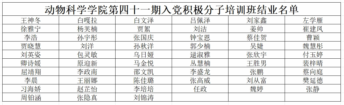 公司第四十一期入党积极分子党课培训已顺利结束。本次培训班从4月24日开班,至5月13日结业考试,经过21学时集中授课,24学时网上系统自学,3学时视频学习及观后交流,3学时义务劳动,8学时党课自主学习汇报,共计59学时。本期学员共有69人,其中有66人参加考试,最后57人通过考试。结业名单如下: