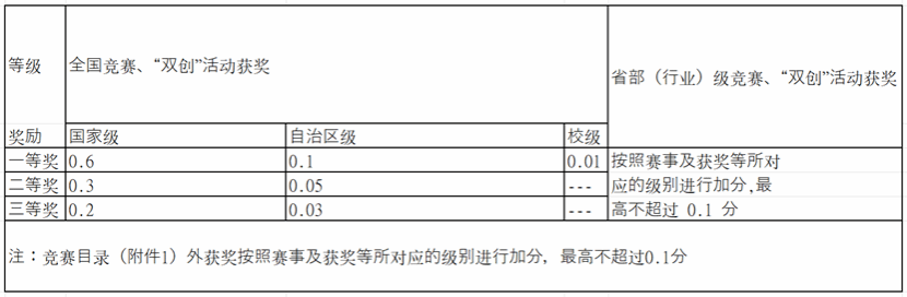 (2)竞赛获奖。以必一运动官网为第一单位,作为主力成员(全国赛国家级奖项前 5 名、省部级奖项前 3 名、校级奖项第 1 名)参加与学业相关的竞赛、“双创”等活动(符合加分要求的竞赛目录详见附件1)获奖者,可按照赛事级获奖情况所对应的级别予以加分(详见表 2),按照赛事及获奖等所对应的级别进行加分;参加国际赛事获奖可参照执行,但不得低于国内赛事相关要求。员工与直系亲属或学历、职称、职务明显高于本人者合作的竞赛奖项仅作为参考,不纳入员工本人推免遴选综合评价成绩计算体系,同等条件下可优先考虑。