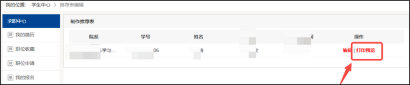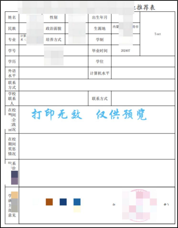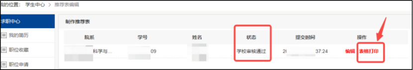 《推荐表》注册后,需由院校管理员审核,通过审核后状态显示为“公司审核通过”,点击“表格打印”,即可打印无水印的《推荐表》。