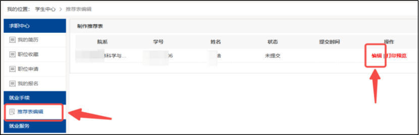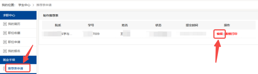 点击“《推荐表》申请”,再点击“编辑”,开始编辑《推荐表》内容,编辑完成后点击“保存并送审”。