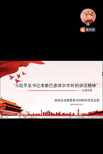 6月11日,公司研究生动物营养与饲料科学党支部在腾讯会议开展学习“习近平总书记考察巴彦淖尔市时的讲话精神”心得分享会,本次会议由党支部全体成员参加,党支部宣传委员董姝慧主持。