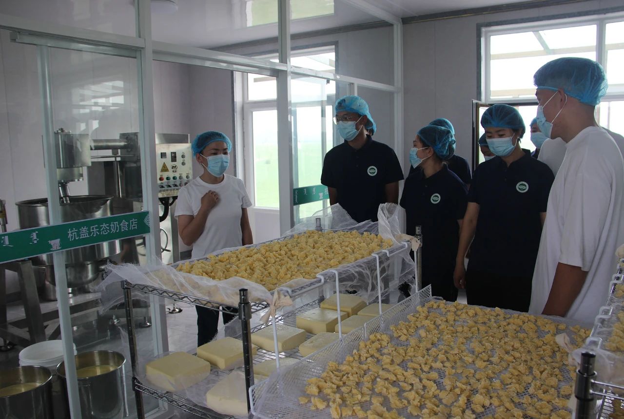 实践活动伊始,其力格尔提出本次活动旨在带领同学们践行“把科技送下乡、把论文写到大地上、把学问做到群众心坎里”的理念,将课堂理论与生产实际紧密结合,把科学技术服务洒在牧区大地。随后,其力格尔为同学们介绍本次要参观的是留学归国青年牧民娜仁高娃创建的杭盖乐态奶食工作坊,要求同学们在参观过程中发挥自身专业优势,行有所思、学有所获。实践活动中,娜仁高娃对西乌旗乡村振兴实践队的走访调研表示热烈的欢迎,并提出希望以本次活动为契机,用青年力量激活产业振兴强大活力,以人才优势奏响乡村振兴奋进强音。期间,在娜仁高娃的带领下,西乌旗乡村振兴实践队一行人首先来到奶食品生产加工车间,实地参观了奶食品加工生产线,对收乳净乳、巴氏杀菌、预热均质、洗瓶灌装、高温灭菌等生产流程和加工工序进行详细地了解。紧接着,娜仁高娃带领老师及同学们来到成品展示区,品尝了新鲜的牛奶与美味的奶食品,使同学们进一步了解了鲜牛奶的营养价值,并对牧区杭盖乐态奶食工作坊的整体经营模式有了更加全面的认识。实践活动最后,其力格尔提出乡村振兴、人才先行,表明公司将不断加深建立产学研一体化科技服务平台,全方位激发人才效能,助力乡村振兴,并要求同学们要牢记习近平总书记关于“中国人的饭碗任何时候都要牢牢端在自己手上”的重要指示,以为老百姓提供优质的“肉、蛋、奶”为己任,继续为乡村振兴贡献青春力量。同学们也纷纷表明要坚定理想信念,以信仰之笔、捧为民之砚、蘸实干之墨,为服务地方发展,助力乡村振兴做出更大的贡献。