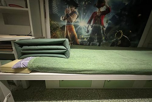 宿舍对他们来说,不仅是一个寝室,更是一个展示退役士兵纪律和精神风貌的空间,是一个延续军人风范的地方,在这个看似平凡却不普通的环境里,公司退役士兵在点滴生活中重拾军旅情怀。走进退役士兵宿舍,被子叠成“豆腐块”,床单抹得没有一丝折痕,四周平整地掖进床垫,摆放整齐的生活用品,干净、明亮、整洁的环境,令人忍不住惊叹。干净整洁的书桌,没有多余杂物,物品摆放井然有序,整齐的同时亦便于生活,什物收纳凝结了从军的智慧。当兵的经历练就了他们严谨的作风,每天打扫宿舍卫生,严格遵守十一点熄灯就寝的作息规律,确保第二天有良好的精神状态,他们用实际行动诠释了军人的精神风貌和动科学子的务实作风,不仅营造了整洁有序的宿舍环境,还有效地提高了学习效律与生活质量。