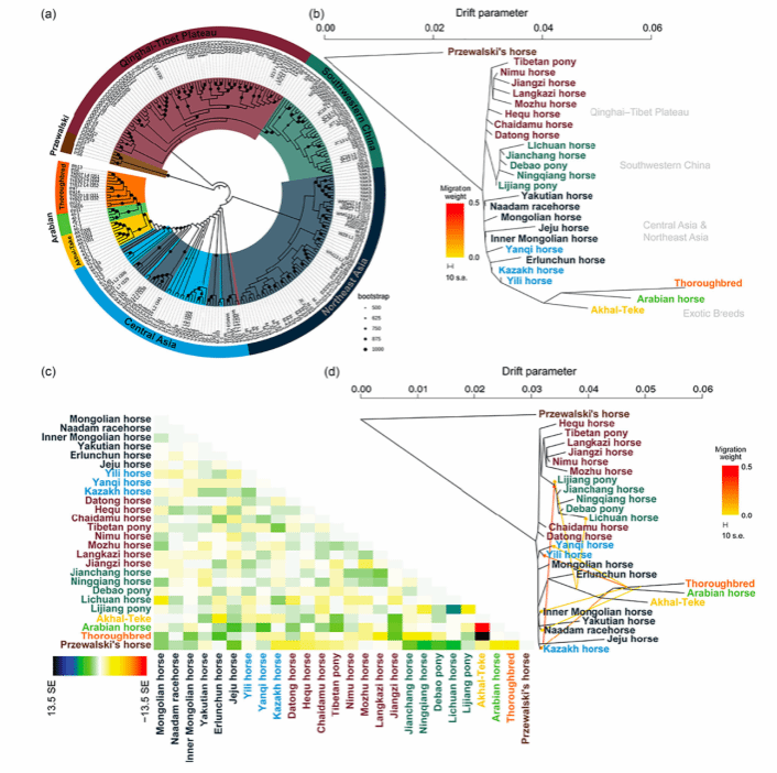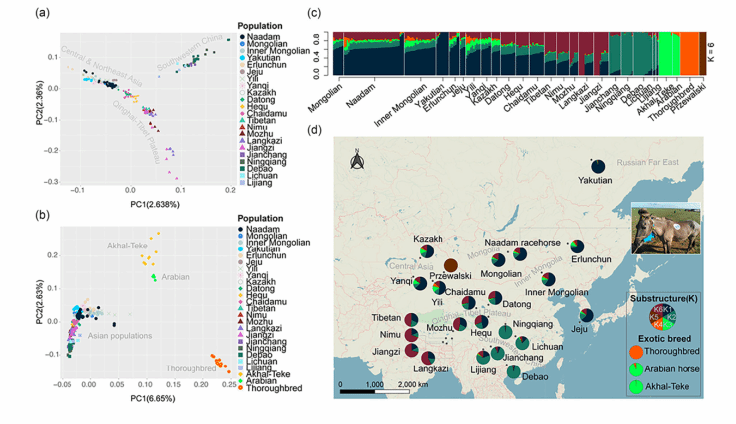 地方家马品种的经济价值下降导致了盲目杂交的蔓延,给其遗传资源的独特性和完整性带来了威胁,严重制约了地方家马品种遗传资源的保护。近年来,芒来教授团队收集了东亚来自不同地理文化背景的21个不同地方家马品种DNA样品。本期《Conservation Letters》报道了芒来教授团队对这些样品进行的群体基因组学研究成果。该论文研究了在那达慕非物质文化遗产保护政策下的蒙古国那达慕赛马,以及来自中国、俄罗斯、韩国等国家的21个地方家马品种,共计248匹家马的全基因组构成。研究结果表明,杂交繁育与地区赛马传统密切相关。赛马传统浓厚且杂交监管不足的地区显示出较高水平的外来品种遗传渗入,正如我国内蒙古和新疆地区的种群。然而,在蒙古国,尽管赛马传统浓厚,但旨在保护蒙古马经济与文化价值的政策实施有效地减少了此类基因渗入。该研究将人类非物质文化遗产保护视作维持和保护地方家马品种经济和文化价值的纽带,为保护地方家马品种的遗传资源并制定相关政策提供了成功案例和启示。