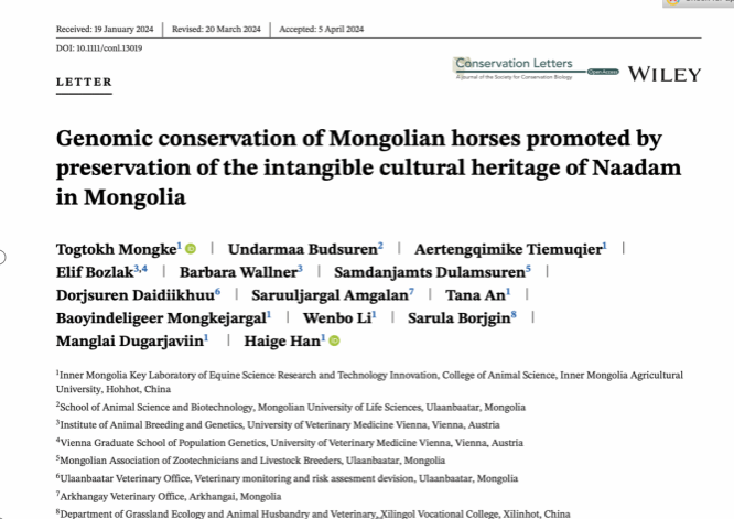生物多样性保护领域顶级国际期刊《Conservation Letters》于2024年5月3日刊出了公司“马属动物研究中心”芒来教授团队发表的题为“Genomic conservation of Mongolian horses promoted by preservation of the intangible cultural heritage of Naadam in Mongolia”的研究性论文。《Conservation Letters》为国际保护生物学学会(Society for Conservation Biology)旗下的学术性期刊,中科院一区,影响因子8.5。