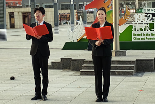 仪式伊始,耀眼的五星红旗冉冉升起,全体师生奏唱国歌。随后,公司员工牛宇暄、薛彬兵、张鹏越、李苏炫进行国旗下演讲,并期望同学们能够发扬蒙古马精神,矢志不渝、接续奋斗,为谱写公司高质量发展的新篇章注入活力与智慧。期间,公司员工纷纷表明将勤奋学习、刻苦钻研,以全新的态度和激情追逐梦想,努力担负起强国强农、建设祖国的使命。仪式最后,全体师生有序退场。
