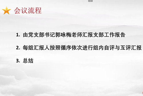 会议伊始,郭咏梅对党支部过去一年的工作情况进行总结,阐明党支部存在的问题,并对全体党员提出要求,明确下一步工作方向。随后,郭咏梅对支部党员学习强国积分情况进行汇报,希望其做到学用结合、以学促用,不断提高党性修养。期间,支部党员依次进行组内自评与互评,并结合自身思想和工作实际,逐一对照检查,深层次排查自身不足,明确整改措施,增强了党支部的凝聚力和战斗力。会议最后,贾宇达提出党支部应结合研究生群体特点进行改进,切实发挥党员的先锋模范作用,共同推动党支部工作再上新台阶。
