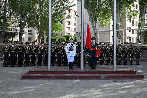 入场仪式结束后,升旗仪式正式开始。升旗手扬起国旗,鲜艳的五星红旗在晨光中舒展。随着激昂的《义勇军进行曲》响彻校园,红旗踏着节拍缓缓升腾,与澄澈蓝天相映成辉。全体师生庄严肃立,齐唱国歌,目光紧紧追随国旗,满含对祖国的热爱与敬意。
