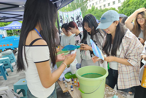 “松鼠与大树”、“不要站起来”、“筷子运乒乓球”三个游戏聚焦反应力与协作力的考验。同学们相互鼓励、默契配合,在欢声笑语中拉近彼此距离。“漆扇艺术体验”区域中,同学们肆意挥洒创意,为传统漆扇添上缤纷色彩,借匠心传承文化之美,将内心思绪化作扇面独一无二的风景。
