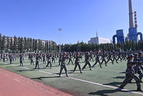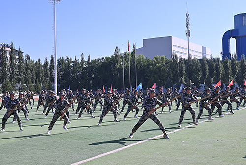 格斗技能验收中,男子刺杀操方队震撼登场,全体队员动作整齐划一、干净利落,突刺时眼神锐利如鹰,格挡时身姿稳如磐石。女子匕首操以飒爽的姿态、利落的动作惊艳亮相,用刚柔并济的风采,成为汇演中一道亮眼的风景线。军体拳方队气氛热烈,一系列动作衔接紧凑、标准规范,拳风凌厉如猛虎下山,踢腿刚劲似雷霆出击,充分展现出新生们朝气蓬勃的精神面貌与坚韧不拔的意志品质。